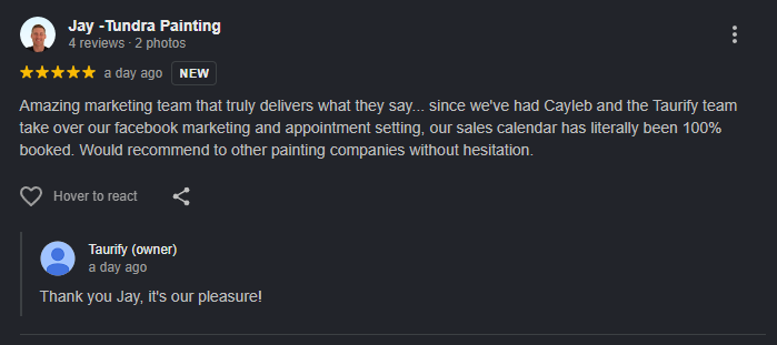 Most agencies stop at generating leads. We go further. Taurify has a proven track record of delivering real booked appointments for painting businesses, not just contact forms that go nowhere.